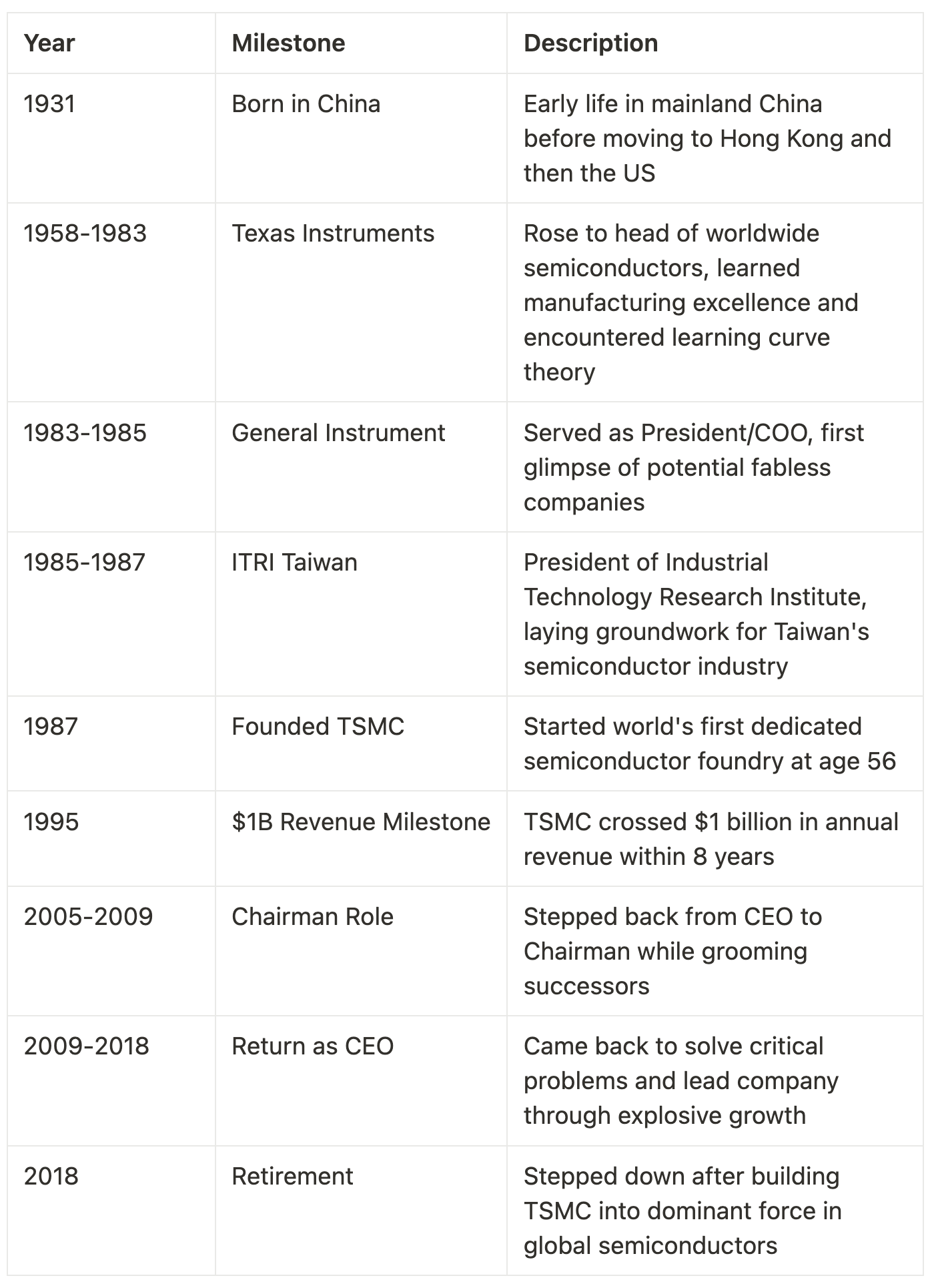 Built TSMC from zero to over $70 billion in annual revenue during his tenure