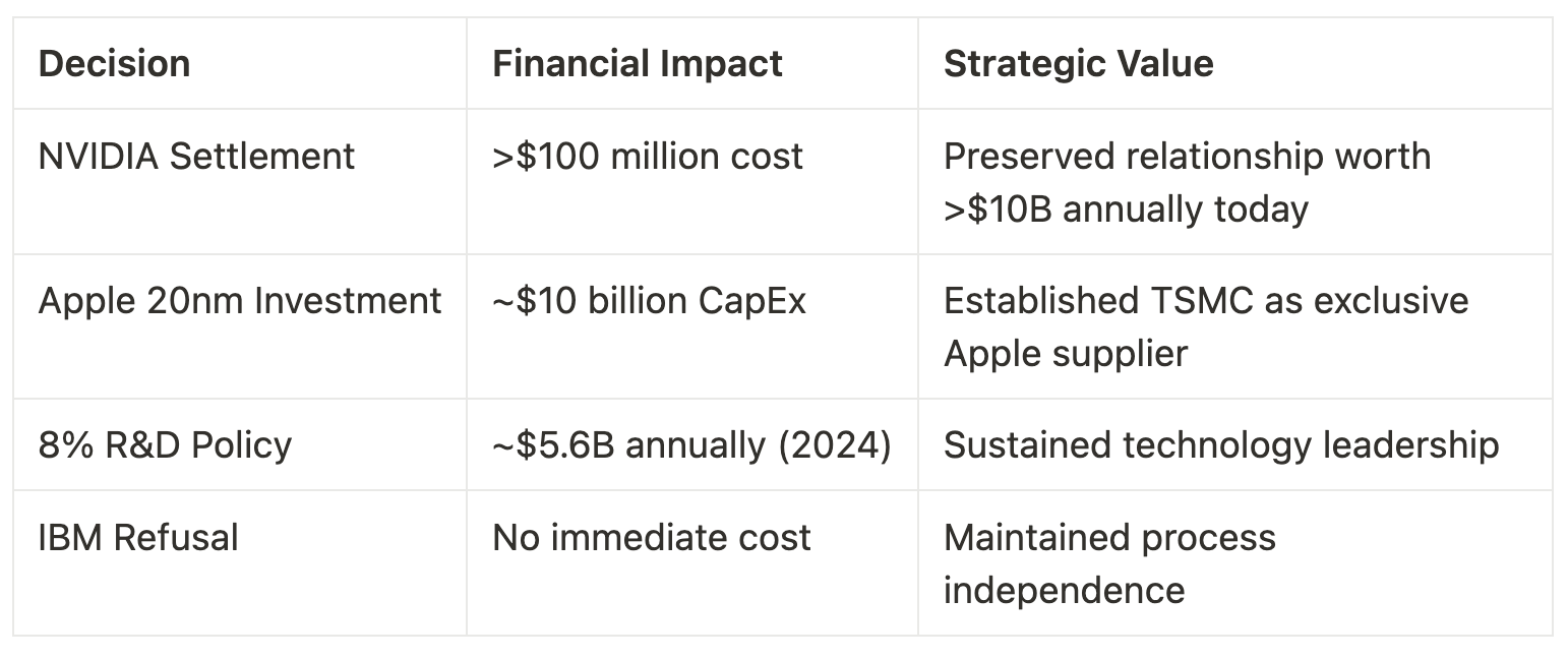 Impact and Analysis: This decision exemplified Chang's relationship-first approach to business. By taking personal responsibility and offering substantial compensation, he preserved what would become one of TSMC's most valuable partnerships. As NVIDIA transformed into the AI computing leader, this relationship became worth hundreds of billions in revenue. The crisis also catalyzed Chang's return as CEO and his landmark decision to set R&D at 8% of revenue permanently.
