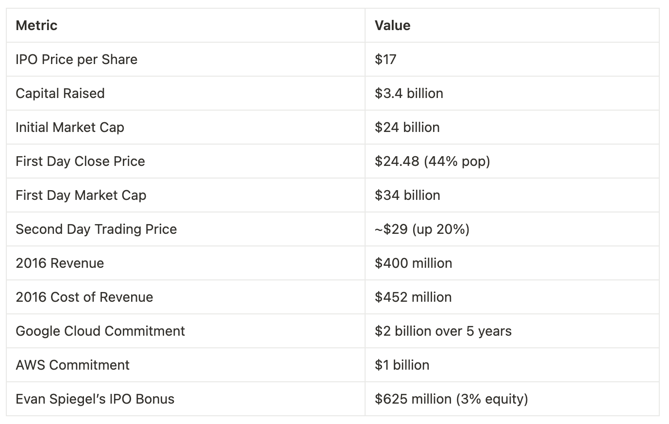 - Financial Challenges: Snap was gross margin negative until recently, with 2016 cost of revenue at $452 million exceeding revenue, largely due to infrastructure costs: “This may actually be the first company to file for an IPO that has a cost of revenue alone higher than revenue.”