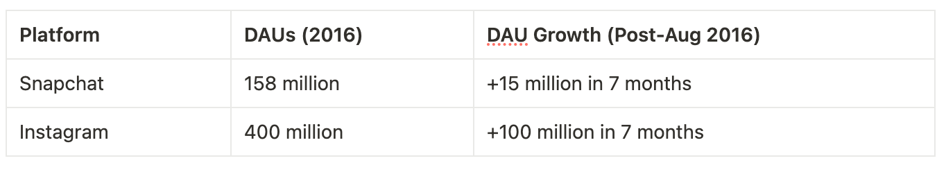 - Growth Problem: User growth slowed, adding only 15 million DAUs post-Instagram Stories, compared to Instagram’s 100 million: “Instagram has added a hundred million daily active users… Snapchat has flatlined.”
